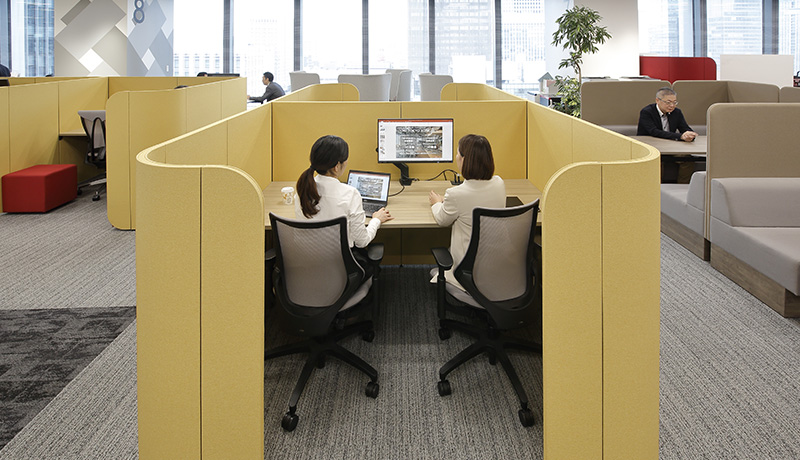 平井 はい。コミュニケーションを高めながら業務が効率よくはかどるように工夫を凝らしています。二人用スペースはここ以外にも、上司と部下の間で評価やキャリア相談などを想定した部屋もあります。そちらは周りが気にならないとか、向き合ったときに緊張せずにリラックスできるよう、考慮された設えになっています。