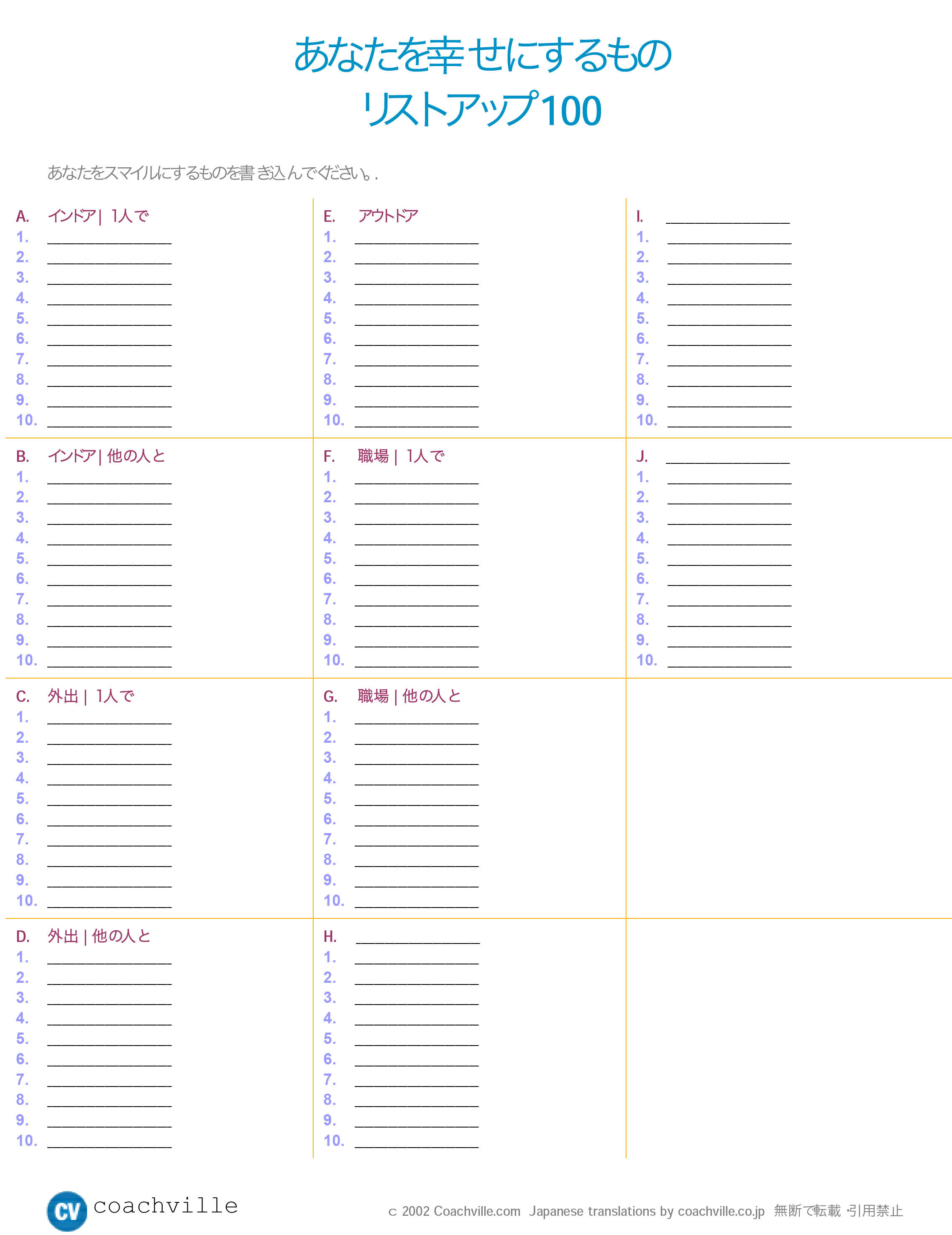 「あなたを幸せにするものリストアップ100」 (Test.jp 内「コーチヴィル」より)