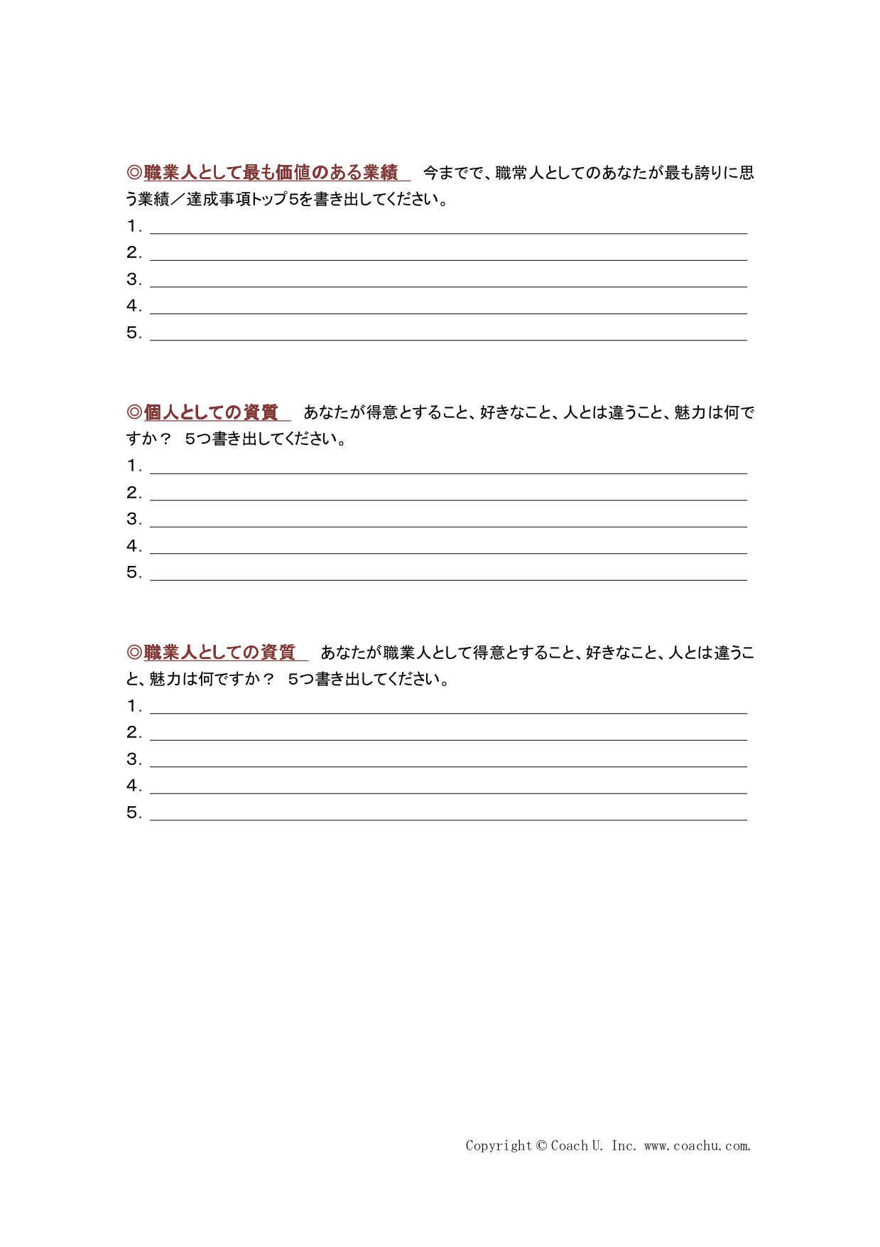 このワークシートを使って、「個人」、「職業人」の両方の観点から、能力、業績、資質について5つずつリストアップしてみましょう。自分のことを複眼的に理解することに役立ちます。