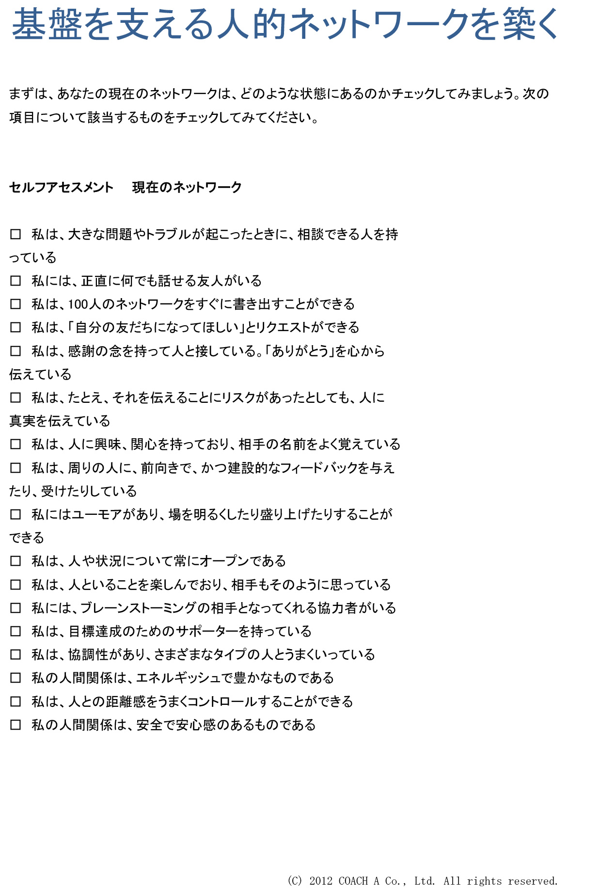 - (「基盤を支える人的ネットワークを築く」セルフアセスメントより)