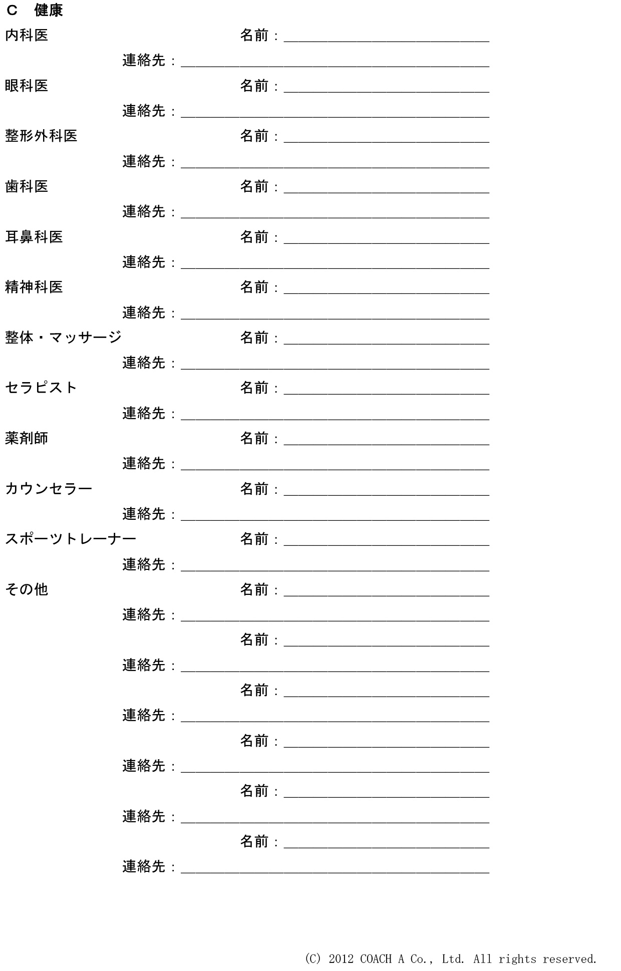 このツールは、6つの領域(仕事、会計と法務、健康、個人的なサービス、セルフケア、その他)にわたって、「100人のサポーター」をリストアップできるシートです。それぞれの領域で、はじめに具体的な項目がかかれているので、リストアップしやすくなっています。(もちろん、自由記入欄もあります。)