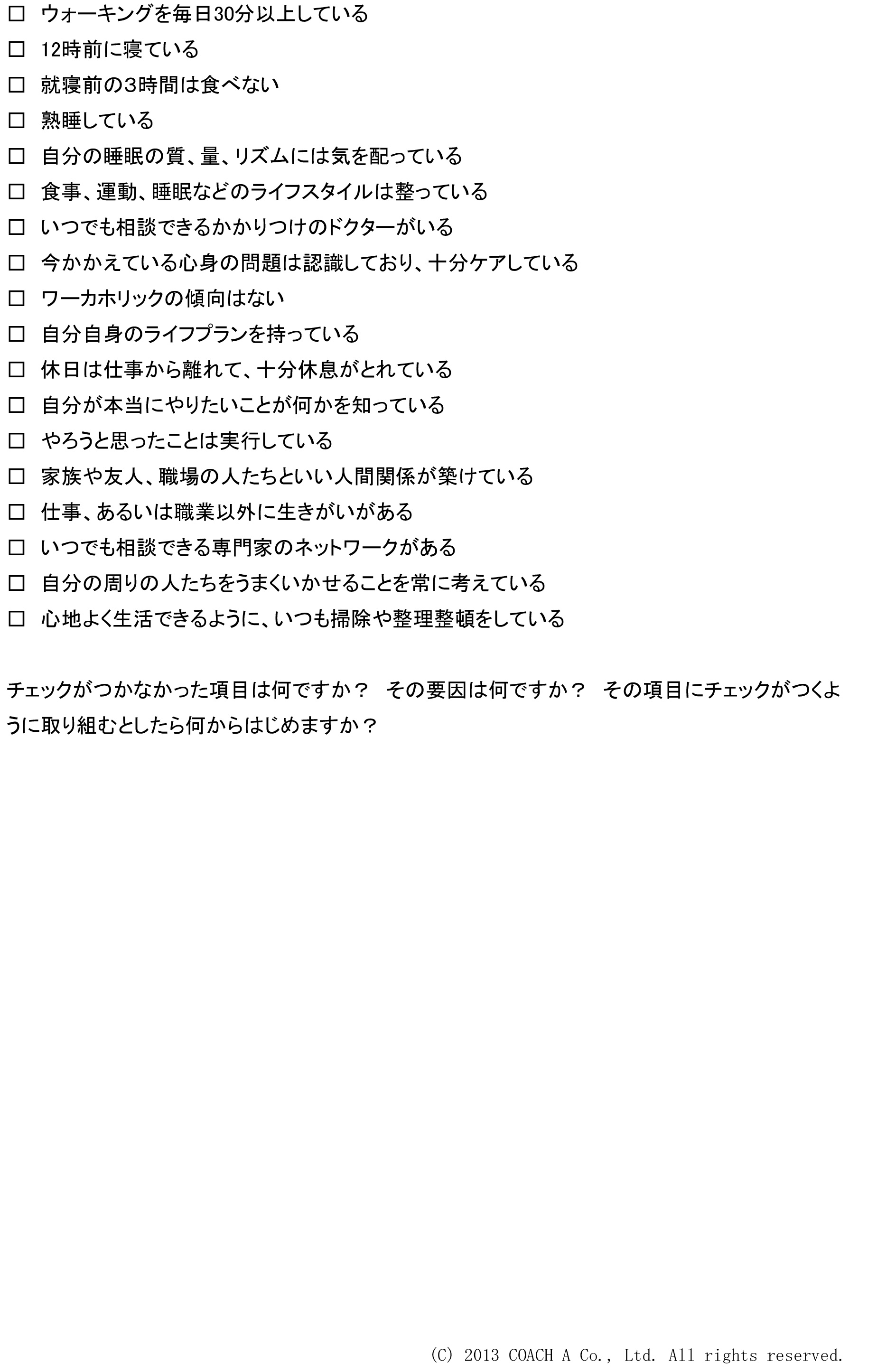 項目はいわば一つの目安です。大切なのは、あなたにとっての快適なバランスを探ること、そしてそのためのヒントを得ること。取り組む時には、その観点から、必要に応じて項目を自分なりに書き直したりするのもOKです。