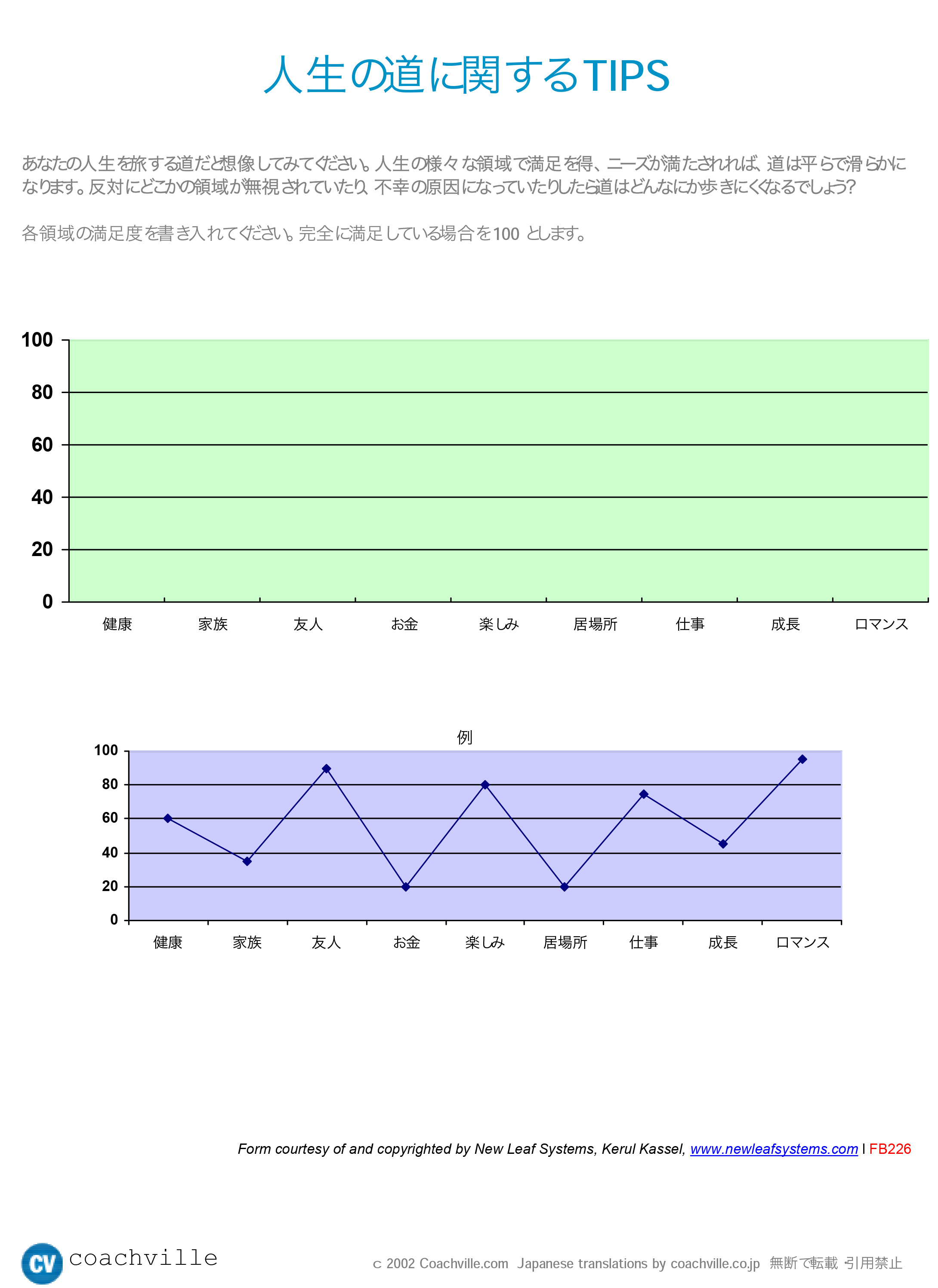 このツールでは、健康、家族、友人、お金、楽しみ、居場所、仕事、成長、ロマンスの領域について、それぞれの満足度をグラフ化し、そのバランスをみます。