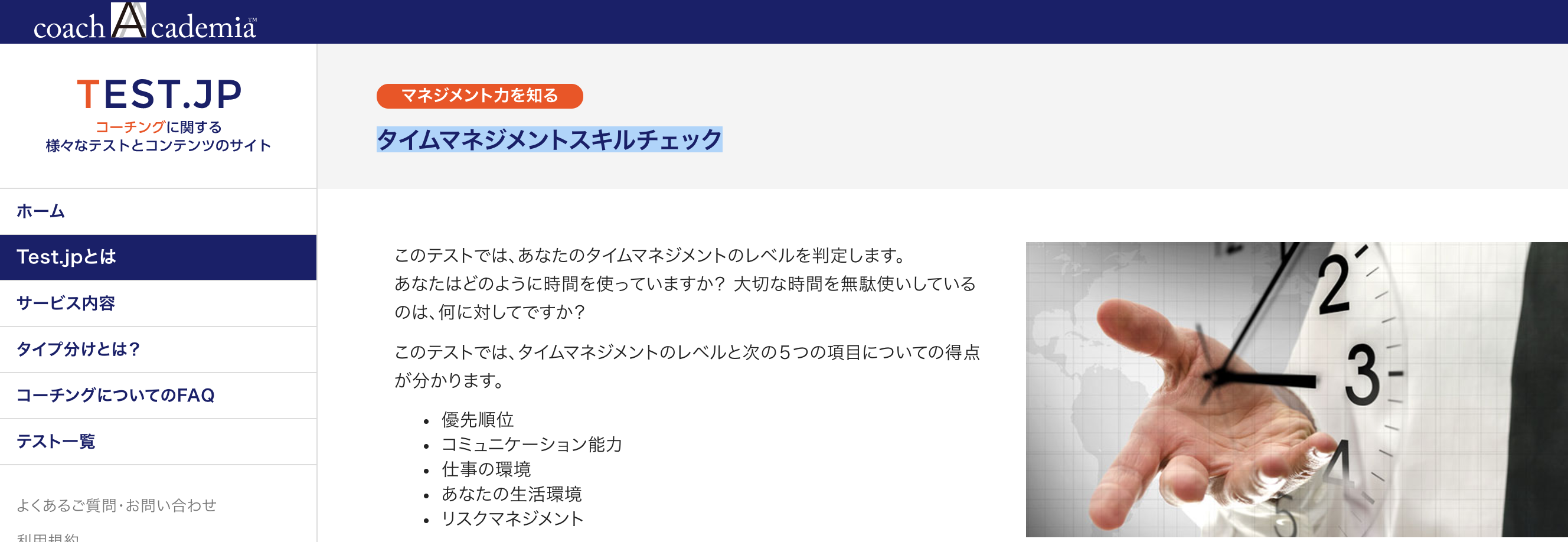 このテストで判定するのは、「タイムマネジメント」のレベルと次の5つの項目についての現状です。