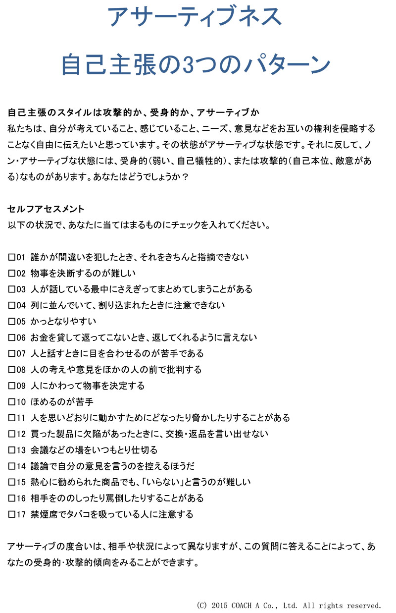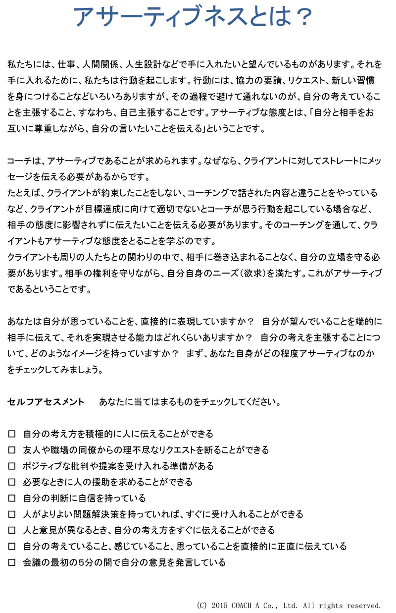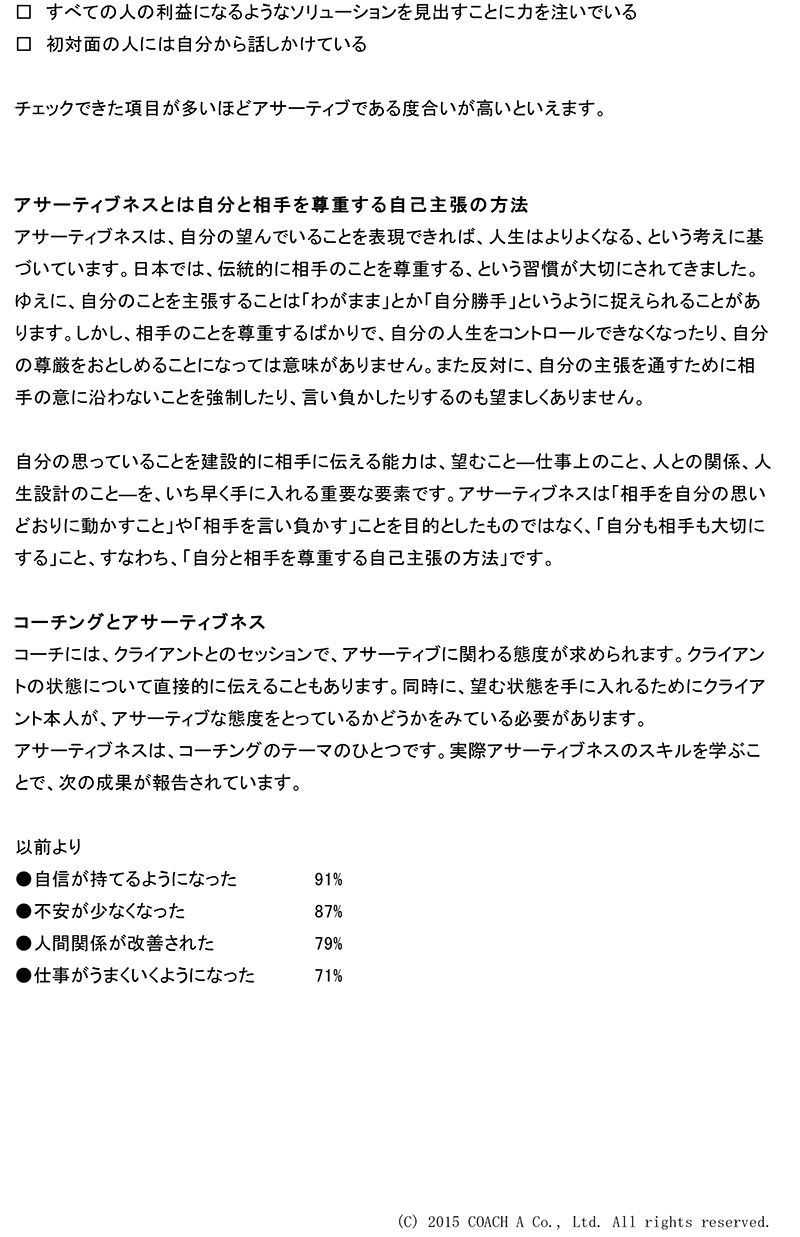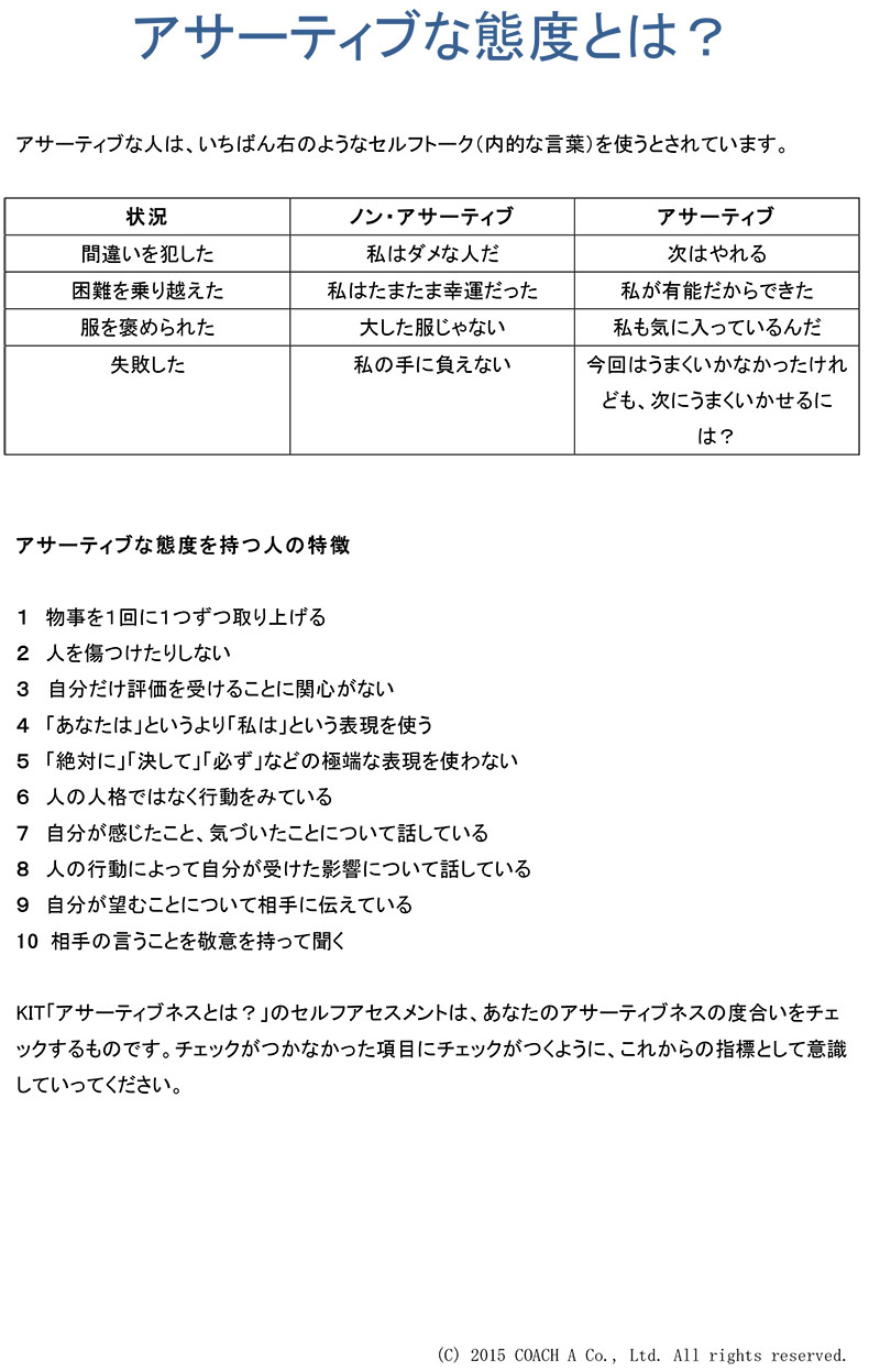 こちらは、アサーティブネスについての簡単な解説とともに、アサーティブ度を測る11項目のセルフアセスメントを掲載。自分が今どのくらいアサーティブかをチェックすることができます。