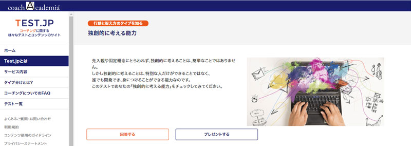 このテストは、"独創的に考えることは、特別な人だけができることではなく、誰でも開発でき、身につけることができる能力"であるという前提のもと、「独創的に考える能力」を32項目でチェック。