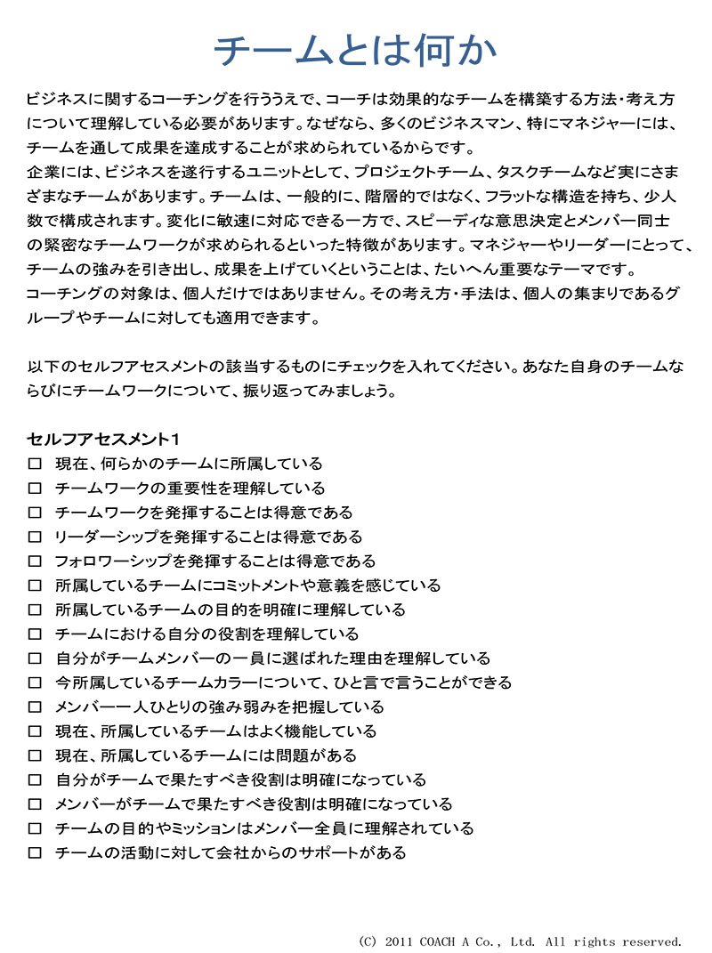 今回ご紹介するのは、チームづくりの能力を「チェック」&「バージョンアップ」させるためのコーチングツール。