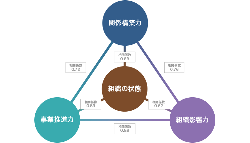 このリサーチからは、「事業推進力」「組織影響力」「関係構築力」の三者が、それぞれ「組織の状態」と相関があることがわかります。