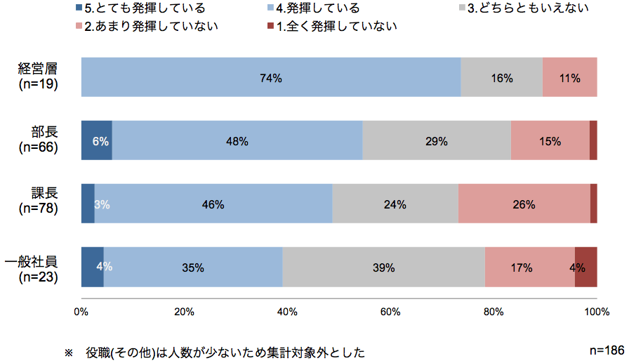 上司の立場からみて、約半数の部下はリーダーシップを発揮しており、役職が上がるほど自分の部下がリーダーシップを発揮していると認識していることがわかります。
