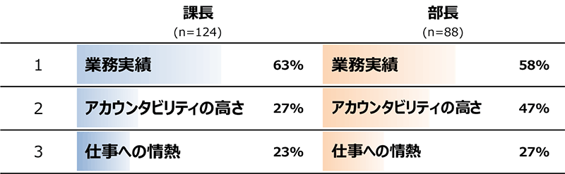 表2は、課長と部長に「あなたが部下の昇進を推薦、または決めるときに、重要視していることを教えてください」と尋ねた結果の各トップ3です。
