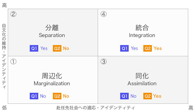 Q1,Q2共に「No」という場合は、自国と赴任先国いずれの文化にも一体感をもてない状態にある、所属している実感を得られない、孤立した状態かもしれません。