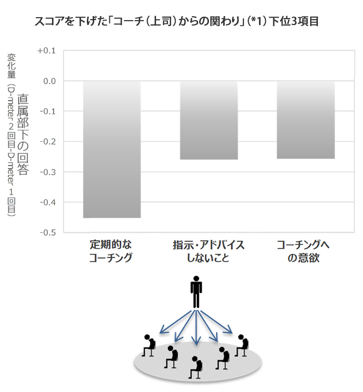 プログラム前後のD-meterの直属部下のスコアを比較。「個人の状態」10項目の変化量が平均以下の群(自己評価、744人)について、DCD参加者の「コーチからの関わり」20項目のうち、スコアが下がった下位3項目を抽出。
