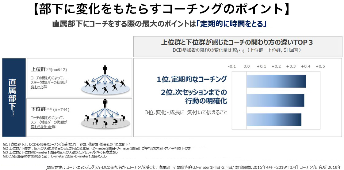 この結果からは、直属の部下をコーチする場合に、その成果を確実なものとするには、次の3点が重要な要素だということがわかります。
