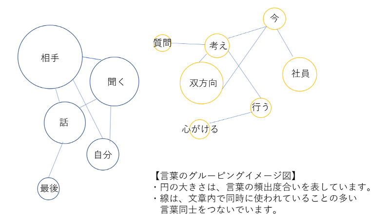 ある企業での『3分間コーチ・ワークショップ』の事後アンケートの中で、よく使われている言葉を抽出、グルーピングしました。