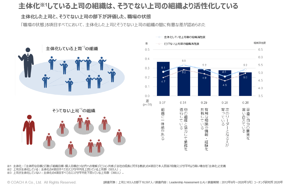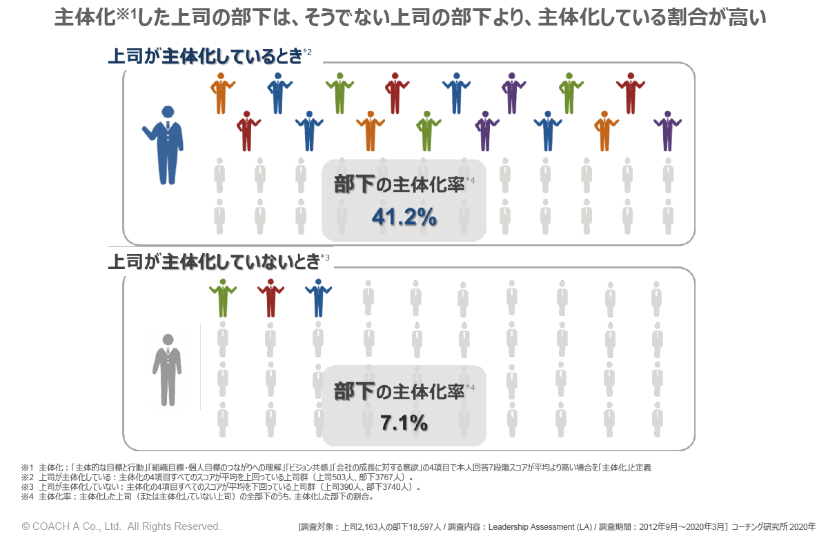 コーチング研究所が、「上司」と「部下」の関係に着目し、組織のリーダー(上司)2,163名のデータを元に分析調査した結果では、上司が「主体化」しているときと、そうでないときでは、部下が「主体化」している度合いに約6倍の違いがあったことが明らかになっています。
