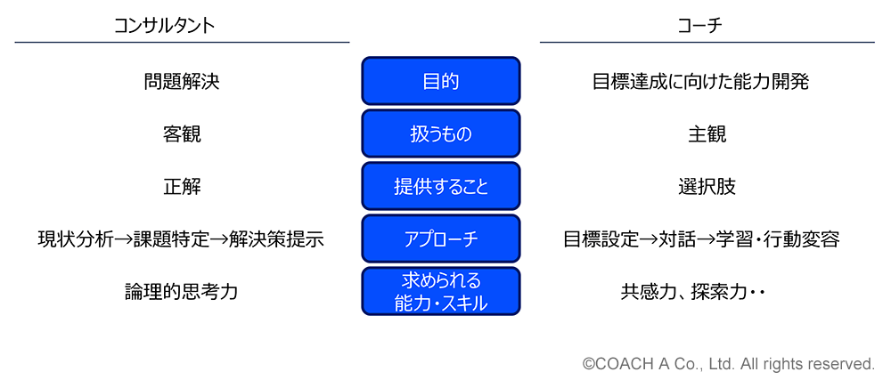 さらに、コンサルティングとコーチングを、目的やアプローチなどの切り口で対比して示したのが以下の図です。
