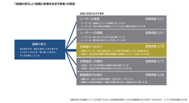 そんなタイミングで、コーチ・エィのコーチング研究所が、興味深いデータを発表しました。それは、組織の変化との相関が高いのは、変革を牽引するリーダー個人の影響力よりも「社員間のつながり」であるというデータです。