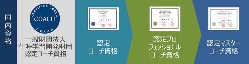初級:「認定コーチ」/中級:「認定プロフェッショナルコーチ」/上級:「認定マスターコーチ」 ※受講コースと条件を満たすことにより、国際資格取得(国際コーチング連盟認定資格)も合わせて目指すことができる |