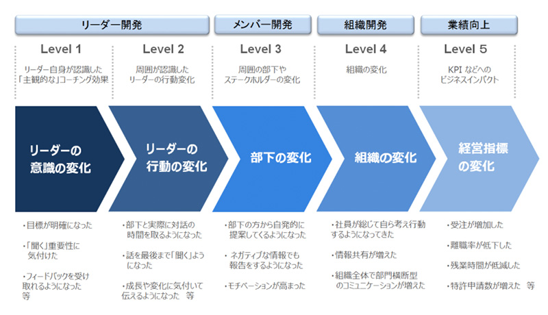 こうした構造の下、リーダー層が組織員に問いかけ、対話の量を増やすことで、組織全体が理想とする組織の状態の実現に向けて自発的な行動を起こしていきます。その結果、プロジェクトの成長速度が高まったり、組織内に新たな連鎖構造が構築されたり、組織風土が改善したりするなど、さまざまな変化が生まれていきます。